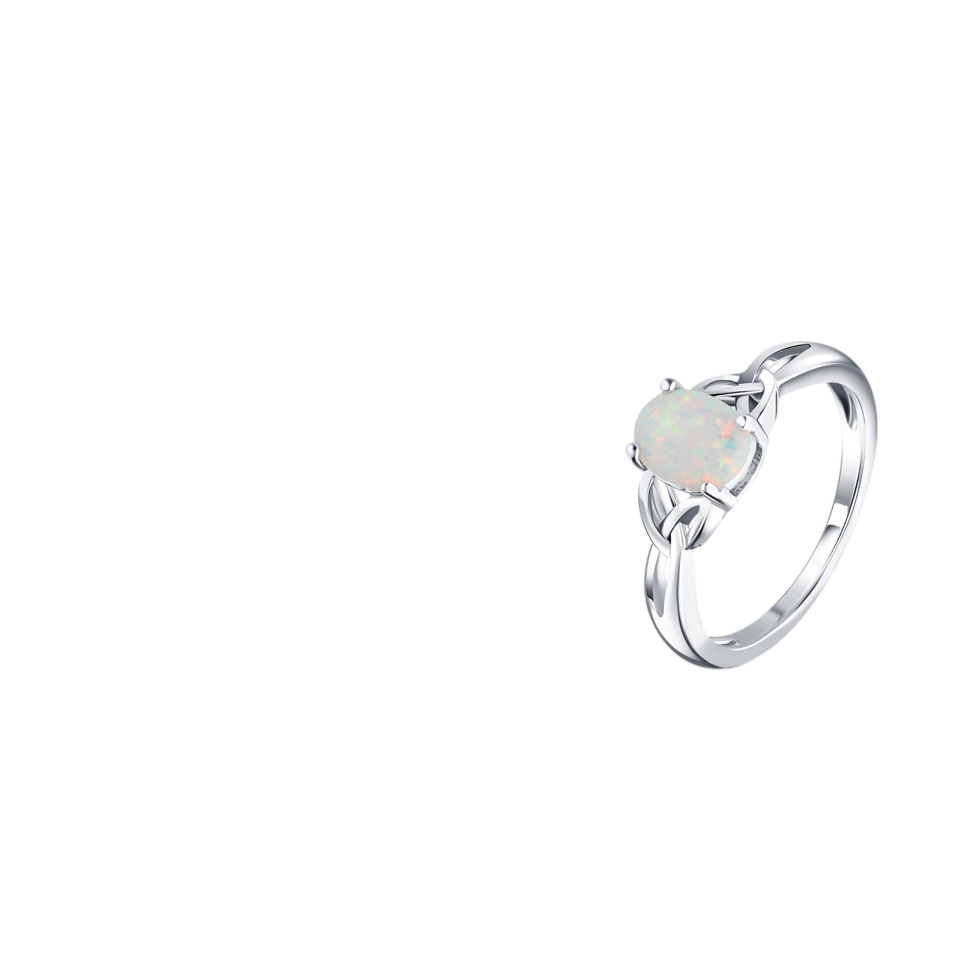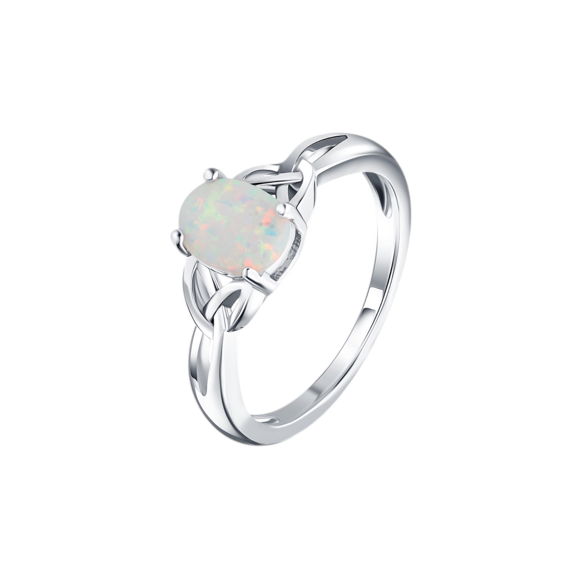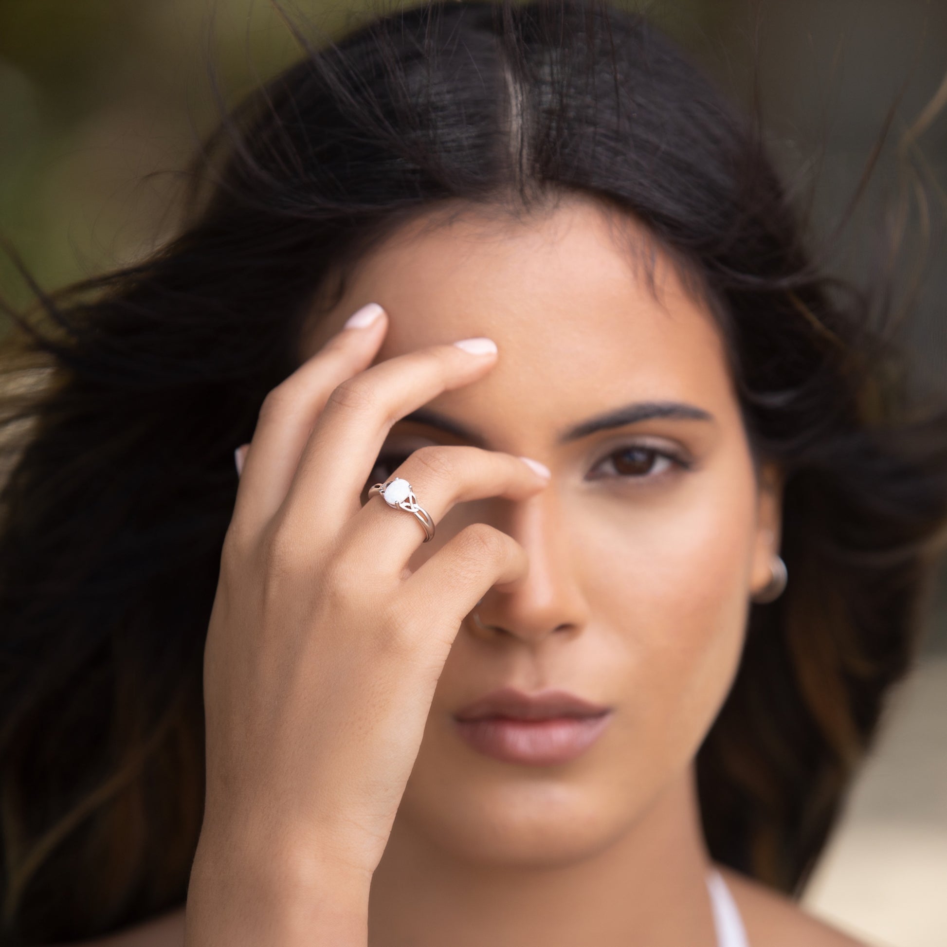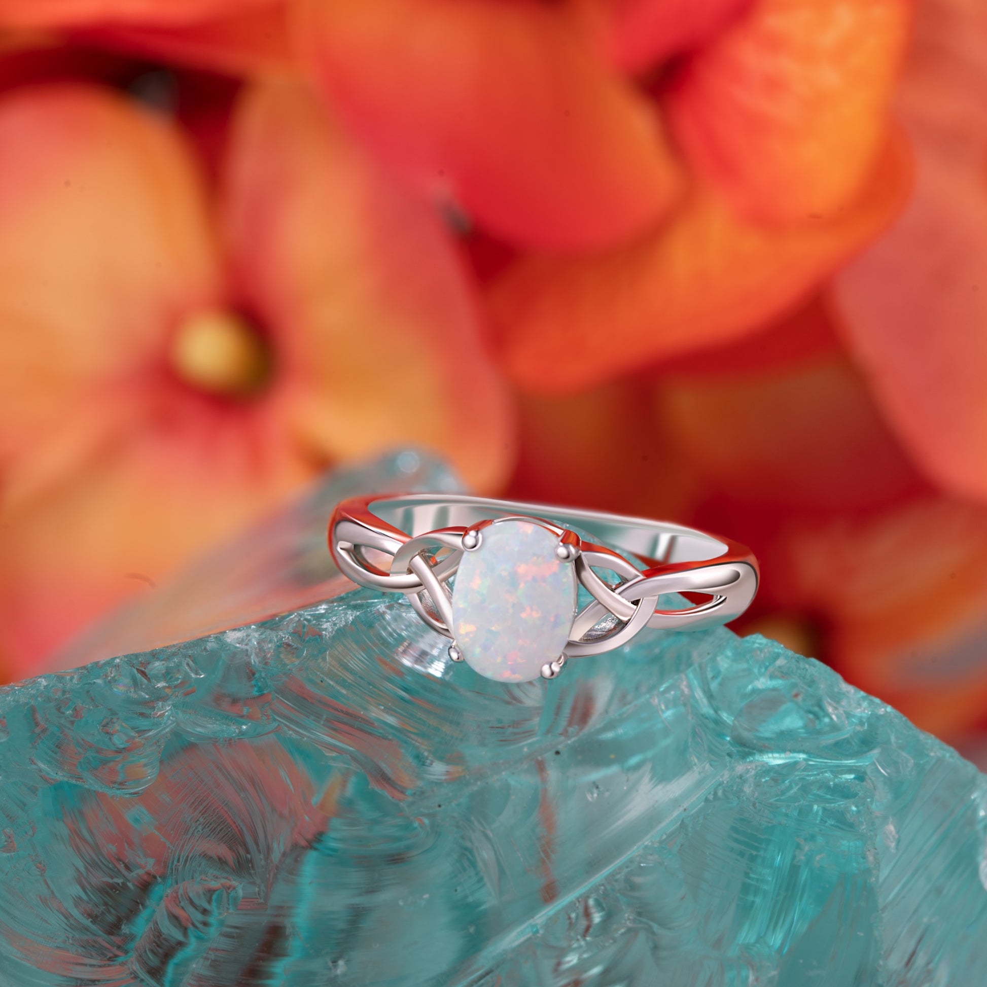Crafted in 925 sterling silver, the Moonlight Knot ring features an iridescent oval-cut opal centerpiece held by a delicate Celtic-inspired knot setting. Its graceful design evokes elegance and mystique—perfect for those who carry a quiet strength and timeless beauty.